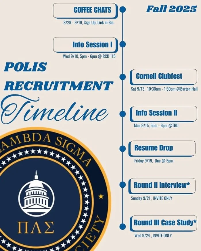 POLIS recruits new members in both the fall and spring semesters. Please follow us on Instagram @poliscornell and revisit this page to stay updated on the Fall 2025 recruitment timeline and the application form.